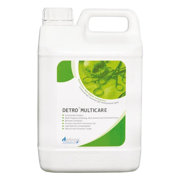 Detro Multicare is a powerful concentrated solution for the care and cleaning of instruments. It is especially designed for use on stainless steel, chrome, nickel plated surfaces and polyvinyl urethane surfaces. Detro Multicare contains phosphoric acid and special cleaners to quickly clean oxidized surfaces and effectively remove surface burns and stains caused by heat. This powerful cleaner easily removes biofilm layers accumulated on surfaces. The product is concentrated and has high material compatibility. Thus, it contributes to the long life of the instruments and prevents wear. Thanks to its powerful formula, Detro Multicare cleans quickly and effectively.